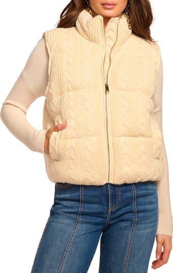 A mix of cables kick up the cozy factor for a zipped vest fixed with a pair of hand-warming pockets.