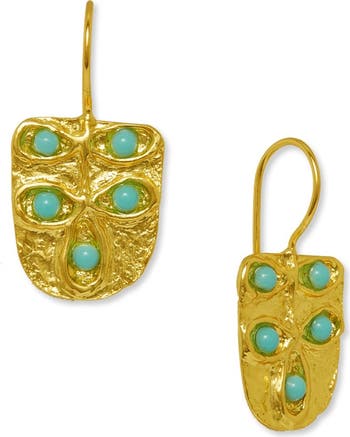 The Vera Turquoise Drop Earrings are the perfect addition for your summer collection, adding a burst of sumptuous blue hues. Handcrafted from 21ct gold-plated recycled brass, these earringngs feature a delicate, sculptural leaf design with vibrant turquoise inlay that evokes the earth’s raw beauty.