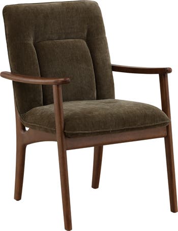 The Vera Dining Chair features a gently curved backrest and upholstered seat designed for comfort and everyday use. A solid wood frame in a warm brown finish adds structure, while the velvet fabric introduces a soft, textured feel. Subtle tailoring along the back and seat enhances its clean, refined profile. Variations in wood grain and fabric texture add to the character of each piece.