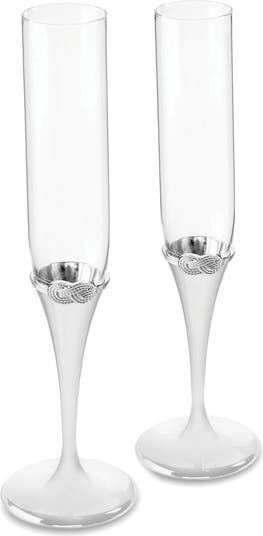 A set of crystal champagne flutes highlighted by an infinity knot-detailed base adds a subtle romantic touch to any toast.