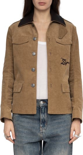 Logo embroidery at the chest adds a sophisticated flourish to a distinguished corduroy jacket topped with a contrast collar.
