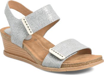 Adjustable straps offer comfort and customization on a woven leather sandal grounded by a suede-lined footbed and stacked wedge heel. Built-in cushioning and heel support provide lasting wear.