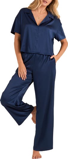 Unwrap these silky, satin PJs for some festive relaxation and the perfect holiday gift. The short-sleeved top has a v-neckline and the elastic waist pants have handy pockets, making this set ideal for cozy Christmas nights and effortless holiday lounging.