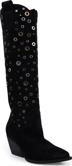 Mixed metallic grommets make a chic, modern statement on a Western-inspired knee-high boot that instantly elevates your look.