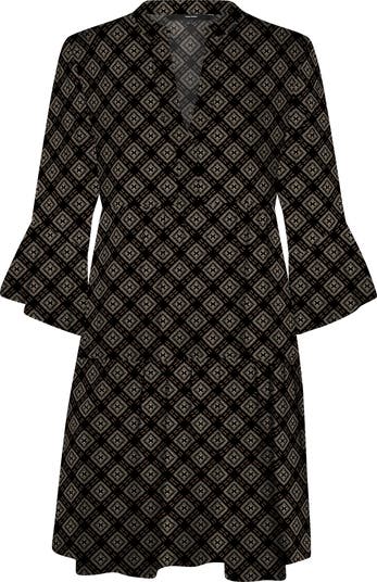 A geometric pattern and flared three-quarter sleeves heighten the retro appeal of this breezy minidress.