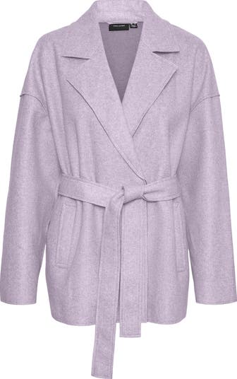 Wide notched lapels grace an effortless wrap jacket perfected by exposed seam details with raw edges.
