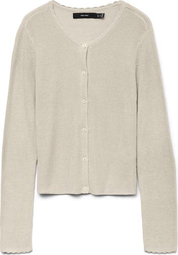 A soft cotton-kissed cardigan is knit with dropped shoulders for a subtly relaxed fit and accented with charming scalloped trim.