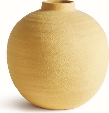 A classic rotund shape and a very narrow opening makes this terracotta vase perfect for a single branch or tall faux floral stem. The cold-finish soft yellow color of this beauty is sure to brighten any space .