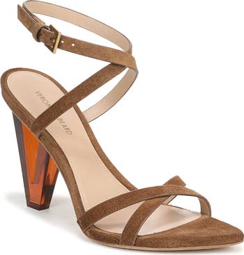 A pointy toe and architectural heel bring sharp angles and dimension to a strappy suede sandal secured with an adjustable buckle closure.