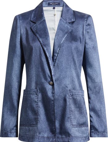 Look closer and you'll see that what looks like a denim blazer is actually made of lustrous satin.