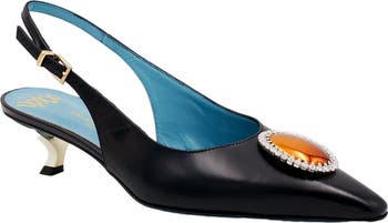 Introducing the Veronika Low Heel Sling Pumps, a perfect blend of elegance and comfort. These pointed slingbacks feature a stunning Cammeo Valentina Rangoni accessory that adds a touch of sparkle to your outfit. Designed with a unique metallic 'comma' kitten heel, these pumps provide stability without compromising on style. Made from luxurious Italian Luce Nappa, they fit true to size and offer a comfortable memory foam insole. Ideal for formal occasions, they embody femininity and sophistication. Elevate your wardrobe with these timeless pumps, perfect for year-round wear.
