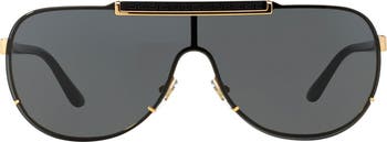 A Greek key–patterned topline lends subtle sophistication to elegant shield sunglasses branded with logo-detailed temples.