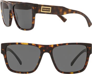 Flat-top sunglasses with a squared-off silhouette feature bold, framed logos at the temples.