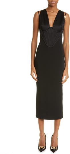 Versace's signature verve thrives on this curve-clinging midi dress that's shaped by a boned, corset-inspired bodice and deeply diving neckline.