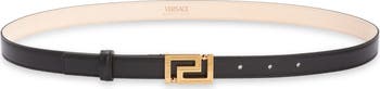 A gleaming buckle cast in Versace's angular Greek-key motif adorns this belt crafted from smooth Italian leather.