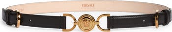 A gleaming Medusa-head medallion brings signature Versace flair to this slim belt that's made in Italy from smooth leather.
