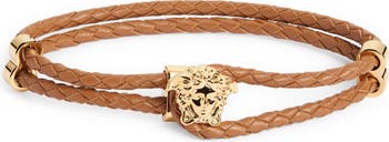 Bring Versace's signature flair to your everyday look with this double-braided leather bracelet agleam with a goldtone Medusa-head clasp.