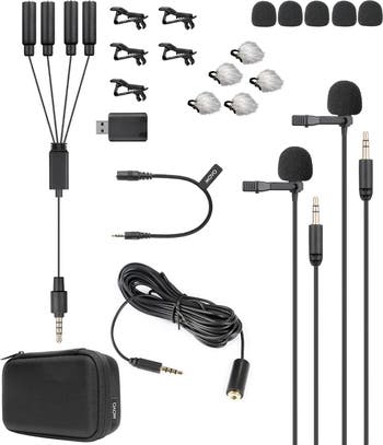 - PRO VOICE CAPTURE: A complete recording kit for capturing voice. Two lav mics, recording splitter with two inputs and two headphone outs, with 3.5mm TRS, 3.5mm TRRS, and USB Output Cables. Great lavalier microphone for Nikon, Sony, and Canon DSLR cameras.