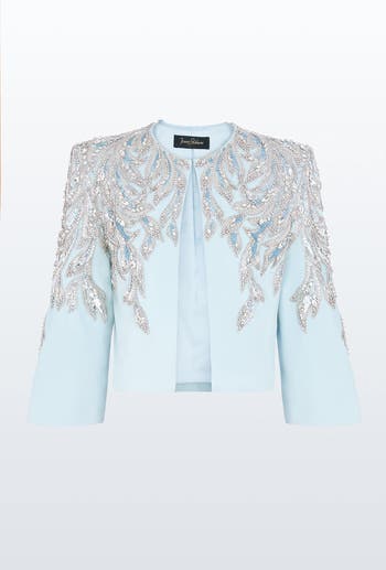 This cropped evening jacket is defined by intricate embellishment that cascades from the shoulders in a leaf-like pattern. The open front and clean neckline keep the silhouette sharp and modern, while the three-quarter sleeves add balance. Its structured shape layers effortlessly over gowns or dresses. A refined finishing piece for formal events or elegant receptions.
