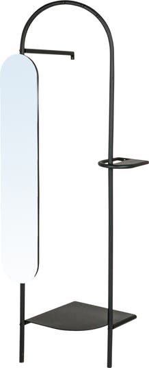 This Versatile Vogue Metal Dressing Mirror is the epitome of chic functionality. Standing tall at 69 inches, with a length of 22.75 inches and a width of 17.75 inches, it's more than just a mirror; it's a statement piece that organizes essentials. The black metal frame encases the reflective glass, while three hooks, two rods, and one shelf provide ample space for hanging and storing daily wear. Whether dressing up for the day or accessorizing for the evening, this mirror is the perfect companion for keeping fashion favorites. Its knock-down design ensures easy transport, making it a stylish and practical choice for any contemporary home.