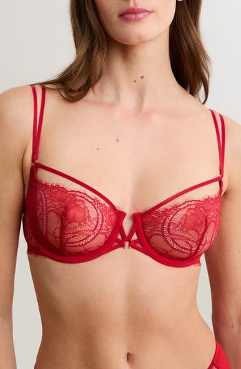 Floral lace highlights the sheer, low-cut cups of a stunning balconette bra lifted with vertical corset-inspired panels and backed with a breathable knit.