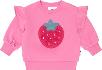 A warm and cosy fluffy terry sweatshirt, with super sweet shoulder frills. It's made from the dreamiest organic cotton that feels like a big hug from your bestie. It features a strawberry embroidery on the tummy.