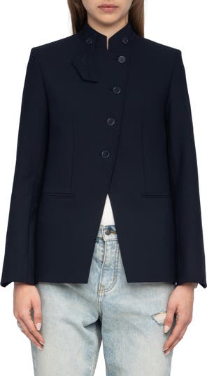 A bit of beadwork brands the throat latch of a cutaway jacket closed with an angled row of tonal buttons.