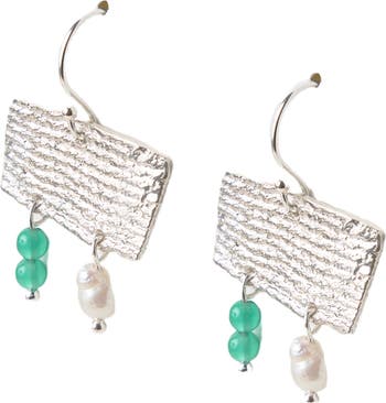- Playful geometry meets natural elegance—textured metal, fresh water pearls, and chalcedony beads in perfect balance.
