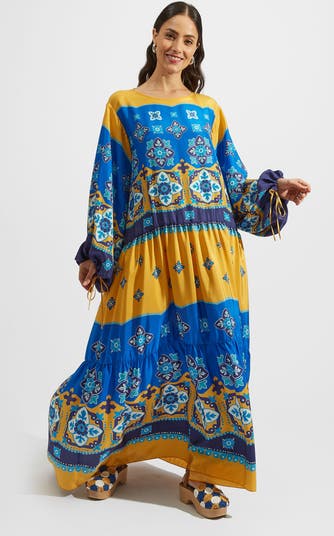 Manifest the holiday of your dreams in this most romantic of folky frocks. Its voluminous romantic shape - think puff sleeves, tiered skirt, uber roomy waist - arrives in our airy 100% silk voile prime for hot summer days that turn into dreamier nights in Puglia or Palermo. With added little details like ties at the sleeve and back, this pull-on number arrives in our hand-placed and ultra elegant Tiles print and is 100% made in Italy (as always).