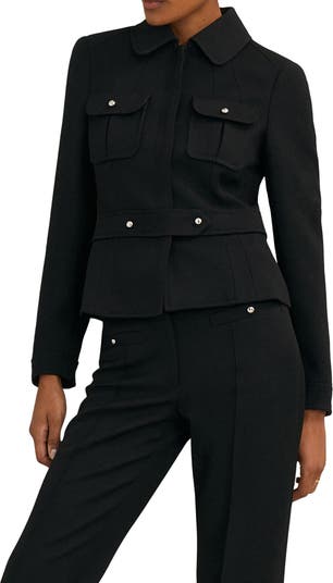 An all-wool jacket strikes a military mood with polished silver buttons and trim tailoring.