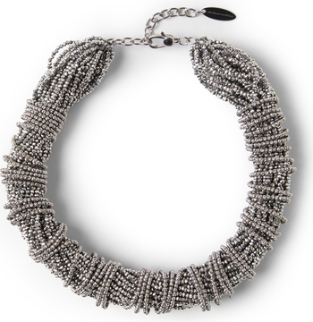 Together with shiny round 975 Sterling Silver beads, the faceted cut of the small Vetro beads accentuates the accessory’s metallic reflections.