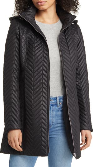 A removable drawstring hood adds versatility to a refined herringbone-quilted jacket with a water-resistant finish.