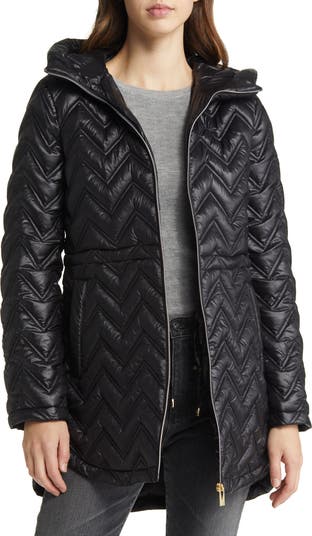 Puffy zigzag quilts add geometric styling to a water-repellent jacket built with a slightly longer hem to protect more of your ensemble from wet weather.