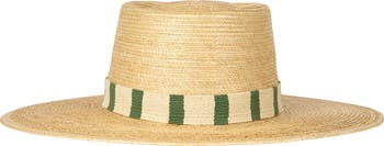 Colorful stripes enliven the woven band that surrounds the crown on this boater-style straw hat handcrafted from palm fronds and styled with a wide, shade-providing brim.
