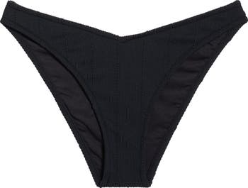 High-cut sides and cheeky back coverage define playful bikini bottoms in a richly textured knit.