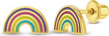Add a splash of joy to her day with these adorable rainbow shaped earrings, hand finished with multicolored enamel that pops with cheerful, vibrant hues. Made from 14k gold over sterling silver, they offer a bright shine and long lasting wear that matches her playful personality. Complete with safety screw backs for secure locking, these happy rainbows are perfect for little ones who love color, imagination, and jewelry that feels like sunshine. A small gift box is included with purchase.