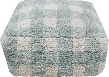 A washable design brings peace of mind when decorating your bustling home with a pretty cotton-blend pouf in a gingham pattern inspired by kitchen linens.