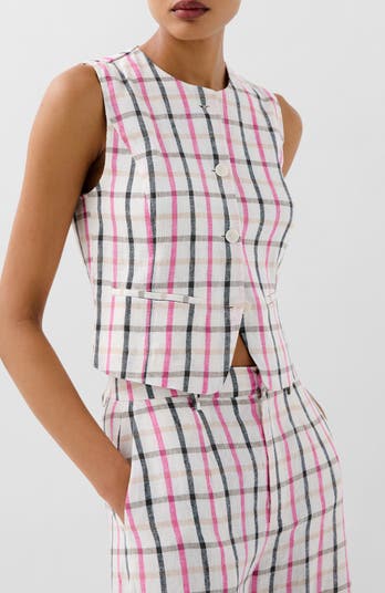 - Sleeveless.Button fastening.Pockets on front. Round neck.