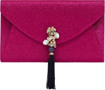 Oversized envelope shape glitter fabric clutch, stone cluster & tassell center piece. This bag comes with a gold snake chain