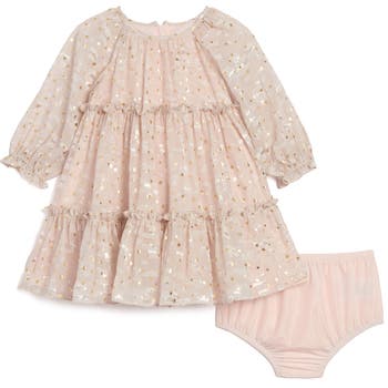 Foil-print stars will have baby twinkling throughout the party in this pretty tiered dress paired with matching bloomers.