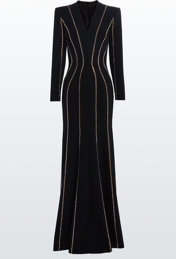 This gown features a sharp V neckline and long sleeves, with vertical embellished lines that contour and elongate the silhouette. The design creates a sculpted effect while maintaining a clean, minimal aesthetic. A soft flare at the hem adds movement without detracting from its structured look. A confident choice for formal evening events or red carpet occasions.