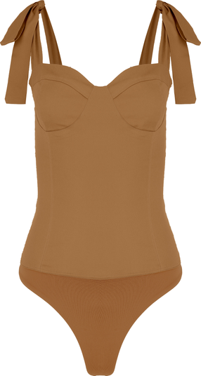 One-piece bodysuit with a curved neckline, soft structured cups, and wide tie straps. Features a smooth, fitted silhouette and smocking at the back