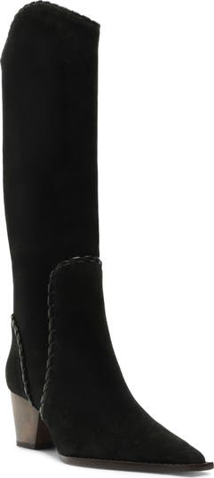 Equestrian influences define knee-high boot shaped from velvety suede with an elongated-square toe, curved topline and richly textured trim. A wooden block heel firmly grounds this Western-inspired style into the contemporary moment.