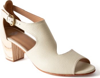 A mid-heel pump with asymmetrical cutouts, a hand-carved wood heel and a sophisticated peep-toe.