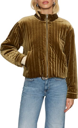 Sumptuous velvet elevates this boxy front-zip jacket made with puffed quilting and a sophisticated stand collar.