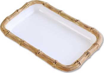 With a cane inspired rim and a brilliant white surface, the small rectangular melamine tray looks great anywhere. Perfect for a variety of serving needs, the VIDA Cane Guest Towel Holder (White and Natural) has the luster, heft and look of a ceramic piece. Holds standard guest towels. Made of luxury melamine for everyday enjoyment, this piece is ideally suited for indoor and outdoor use.