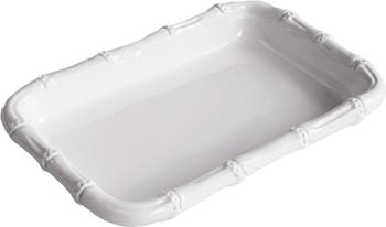 With a cane inspired rim and a brilliant white surface, the small rectangular melamine tray looks great anywhere. Perfect for a variety of serving needs, the VIDA Cane Guest Towel Holder (White) has the luster, heft and look of a ceramic piece. Holds standard guest towels. Made of luxury melamine for everyday enjoyment, this piece is ideally suited for indoor and outdoor use.
