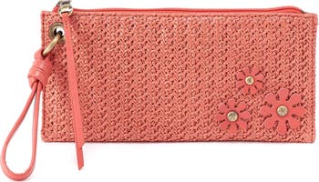 Aged-finish hardware and floral appliqués highlight a slender wristlet featuring an intricately woven exterior and optional wrist strap for on-the-go convenience.