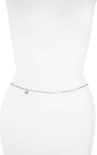 A single sparkling butterfly dangles from a gilded flat-link belly chain plated in 18-karat gold and full of charm.