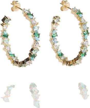 Dazzle in dreamy shades of turquoise and teal opal with these statement-making 14K gold plated hoop earrings. Designed with an artful mix of marquis, baguette, and trillion-cut cubic zirconia, each stone catches the light from every angle. The vibrant opal and turquoise tones add depth and dimension, creating a look that feels both elevated and playful. Measuring 2 inches, they’re bold enough to stand alone yet refined enough to wear from day to night.